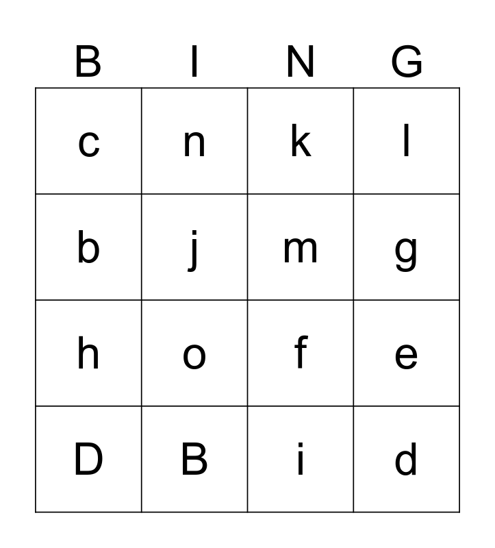 This bingo card has 16 words: B, e, k, c, h, n, f, i, b, j, D, l, o, g, m and d.