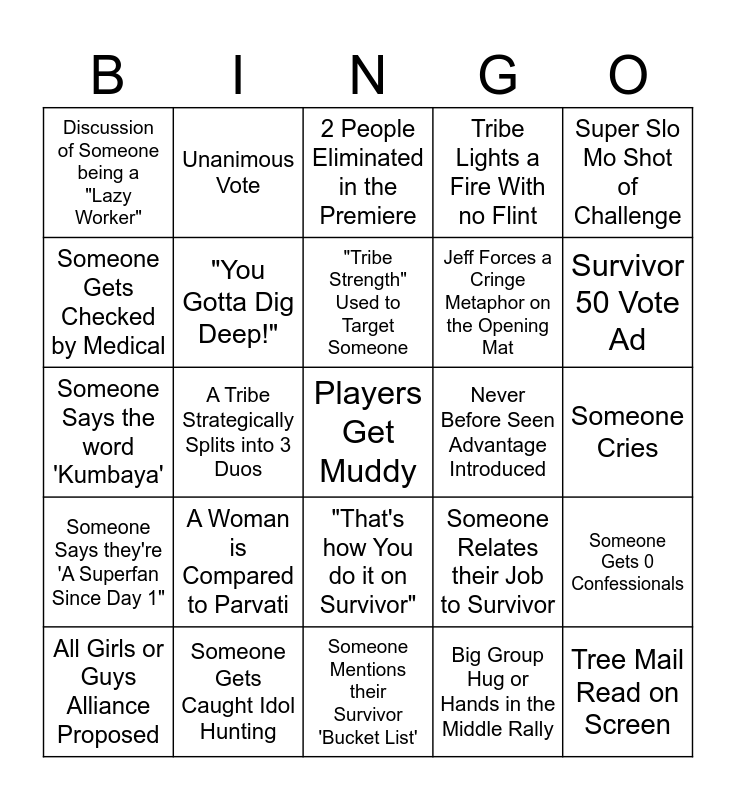 This bingo card has a free space and 24 words: All Girls or Guys Alliance Proposed, A Woman is Compared to Parvati, "Tribe Strength" Used to Target Someone, Big Group Hug or Hands in the Middle Rally, Super Slo Mo Shot of Challenge, Discussion of Someone being a "Lazy Worker", Unanimous Vote, 2 People Eliminated in the Premiere, Never Before Seen Advantage Introduced, Someone Cries, Someone Says the word 'Kumbaya', "You Gotta Dig Deep!", Someone Relates their Job to Survivor, Someone Gets 0 Confessionals, Someone Gets Checked by Medical, Someone Gets Caught Idol Hunting, Someone Mentions their Survivor 'Bucket List', Tribe Lights a Fire With no Flint, Survivor 50 Vote Ad, Someone Says they're 'A Superfan Since Day 1", A Tribe Strategically Splits into 3 Duos, "That's how You do it on Survivor", Jeff Forces a Cringe Metaphor on the Opening Mat and Tree Mail Read on Screen.