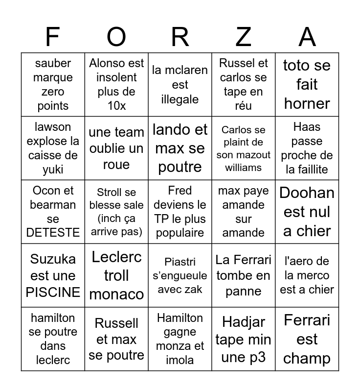 This bingo card has a free space and 24 words: Leclerc troll monaco, Russell et max se poutre, lando et max se poutre, hamilton se poutre dans leclerc, toto se fait horner, sauber marque zero points, lawson explose la caisse de yuki, Alonso est insolent plus de 10x, max paye amande sur amande, Piastri s’engueule avec zak, Carlos se plaint de son mazout williams, Ocon et bearman se DETESTE, La Ferrari tombe en panne, l'aero de la merco est a chier, une team oublie un roue, Hadjar tape min une p3, Doohan est nul a chier, la mclaren est illegale, Haas passe proche de la faillite, Stroll se blesse sale (inch ça arrive pas), Ferrari est champ, Suzuka est une PISCINE, Russel et carlos se tape en réu and Hamilton gagne monza et imola.