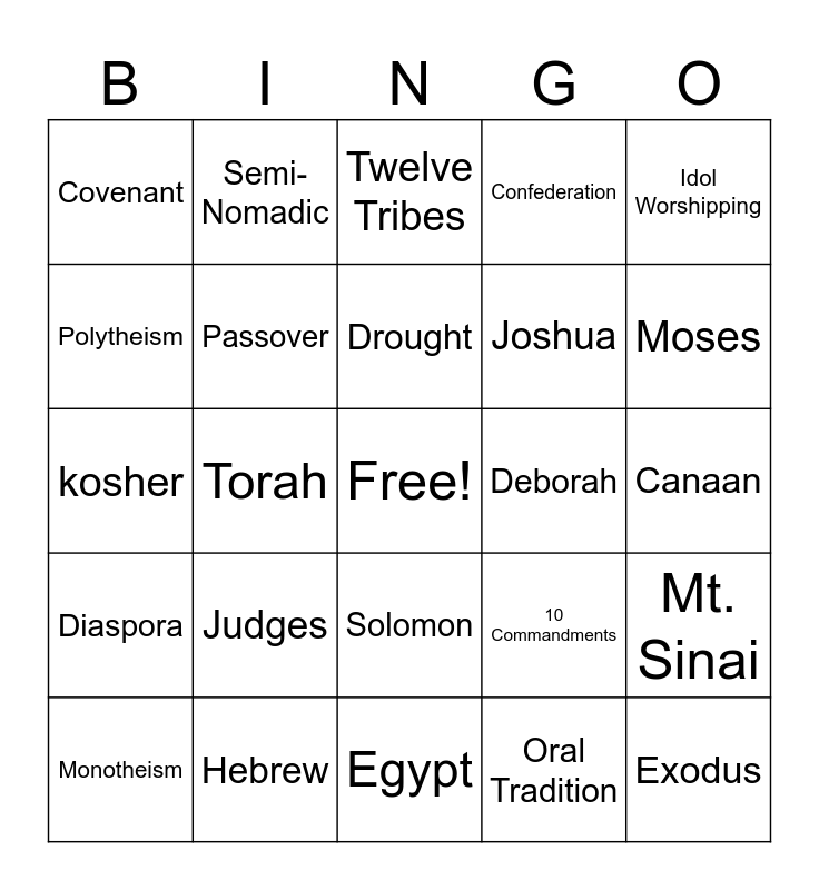 This bingo card has a free space and 29 words: Monotheism, Abraham, Torah, Moses, Covenant, Twelve Tribes, Passover, Judges, Deborah, Hebrew, Canaan, Exodus, Egypt, Oral Tradition, Moses, David, Solomon, Diaspora, Idol Worshipping, kosher, 10 Commandments, Jacob, Joshua, Polytheism, Confederation, Semi- Nomadic, Mt. Sinai, Drought and Sabbath.