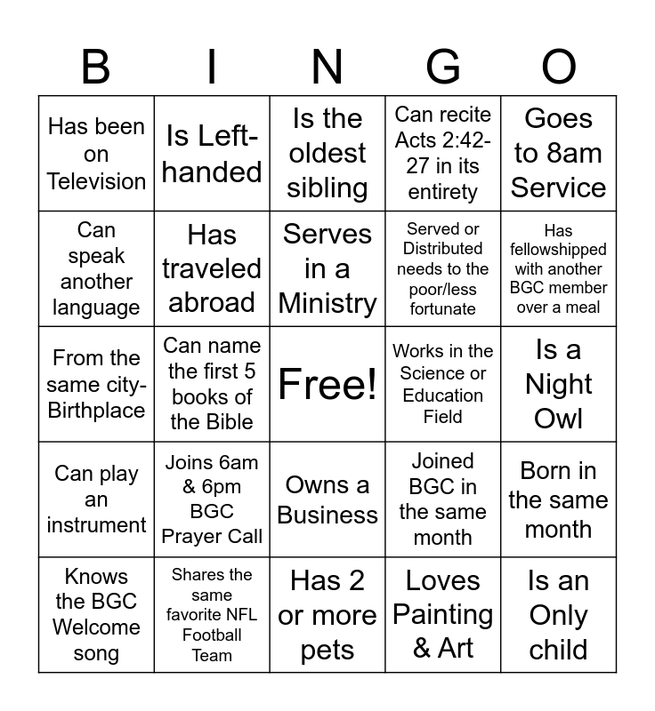 This bingo card has a free space and 24 words: Joins 6am & 6pm BGC Prayer Call, Shares the same favorite NFL Football Team, Serves in a Ministry, Knows the BGC Welcome song, Goes to 8am Service, Has been on Television, Can speak another language, Is Left-handed, Works in the Science or Education Field, Owns a Business, Served or Distributed needs to the poor/less fortunate, From the same city- Birthplace, Joined BGC in the same month, Born in the same month, Has traveled abroad, Loves Painting & Art, Is a Night Owl, Is the oldest sibling, Has fellowshipped with another BGC member over a meal, Can name the first 5 books of the Bible, Is an Only child, Can play an instrument, Can recite Acts 2:42-27 in its entirety and Has 2 or more pets.