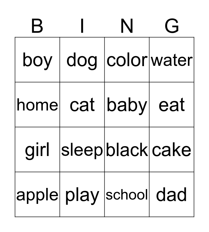This bingo card has 16 words: play, cake, color, boy, girl, dog, black, school, home, cat, apple, water, sleep, eat, baby and dad.