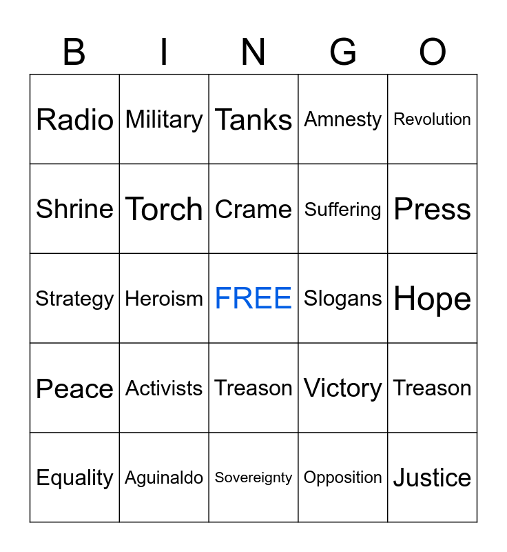 This bingo card has a free space and 104 words: EDSA, PeoplePower, Revolution, Democracy, Protest, Freedom, MartialLaw, Marcos, Aquino, Ninoy, Elections, Dictatorship, Yellow, Peaceful, Nonviolent, Soldiers, Tanks, Protesters, CardinalSin, February, Malacañang, Manila, Voting, Regime, Assassination, Activists, Press, Amnesty, Constitution, Unity, Victory, Opposition, Fraud, Rights, Veritas, Church, Laban, Imelda, Crame, Aguinaldo, Cory, Peace, Mass, Shrine, Anniversary, Radio, Movement, Justice, Power, History, Transition, Resignation, Exile, Hawaii, Reconciliation, Citizens, Rally, Courage, Dictator, Treason, Hope, Speech, Reforms, Legacy, Youth, Loyalists, Change, Military, Strategy, Heroism, Sovereignty, Inflation, Corruption, Journalists, Leadership, Resistance, Struggle, Equality, Empowerment, Repression, Violence, Teargas, Torch, Flags, Slogans, Mobilization, Awareness, Determination, Humanity, Persistence, Symbolism, Broadcast, Newspaper, Treason, Legacy, SupremeCourt, Campaign, Suffering, Determination, Sacrifice, Tyranny, Transition, Independence and Future.
