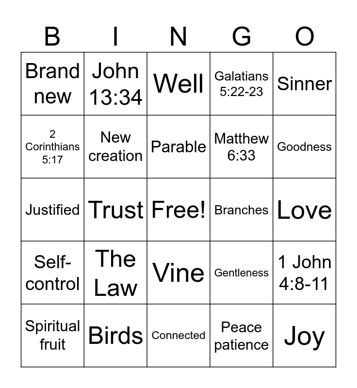 This bingo card has a free space and 30 words: Birds, Flowers, Trust, Worry, Brand new, Well, New creation, Vine, Branches, Connected, Love, Joy, Peace patience, Kindness, Goodness, Faithfulness, Gentleness, Self-control, The Law, Sinner, Justified, Atoning, John 13:34, Matthew 6:33, 2 Corinthians 5:17, Galatians 5:22-23, 1 John 4:8-11, Spiritual fruit, Parable and Humble.