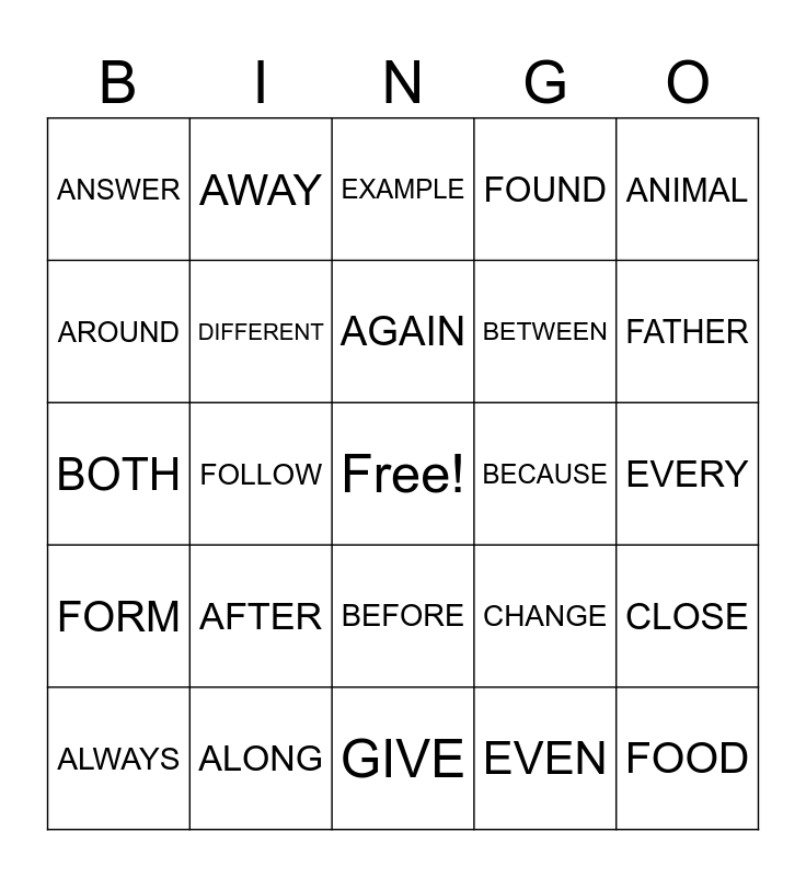 This bingo card has a free space and 24 words: AFTER, ALONG, AGAIN, ALWAYS, ANIMAL, ANSWER, AROUND, AWAY, BECAUSE, BEFORE, BETWEEN, BOTH, CHANGE, CLOSE, DIFFERENT, EVEN, EVERY, EXAMPLE, FATHER, FOLLOW, FOOD, FORM, FOUND and GIVE.
