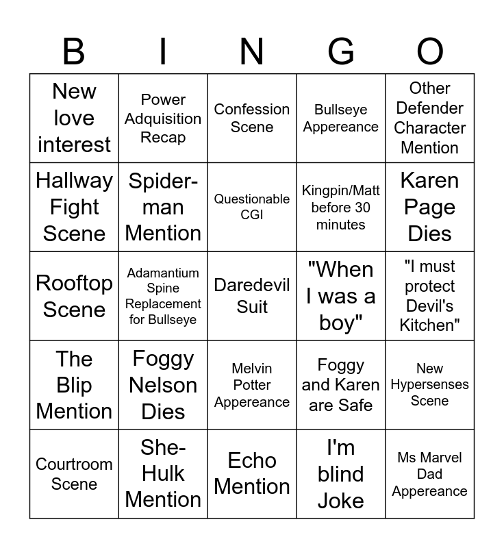 This bingo card has a free space and 24 words: Foggy Nelson Dies, She-Hulk Mention, Questionable CGI, Courtroom Scene, Other Defender Character Mention, New love interest, Hallway Fight Scene, Power Adquisition Recap, "When I was a boy", Melvin Potter Appereance, Kingpin/Matt before 30 minutes, Rooftop Scene, Foggy and Karen are Safe, New Hypersenses Scene, Spider-man Mention, I'm blind Joke, "I must protect Devil's Kitchen", Confession Scene, Karen Page Dies, Adamantium Spine Replacement for Bullseye, Ms Marvel Dad Appereance, The Blip Mention, Bullseye Appereance and Echo Mention.