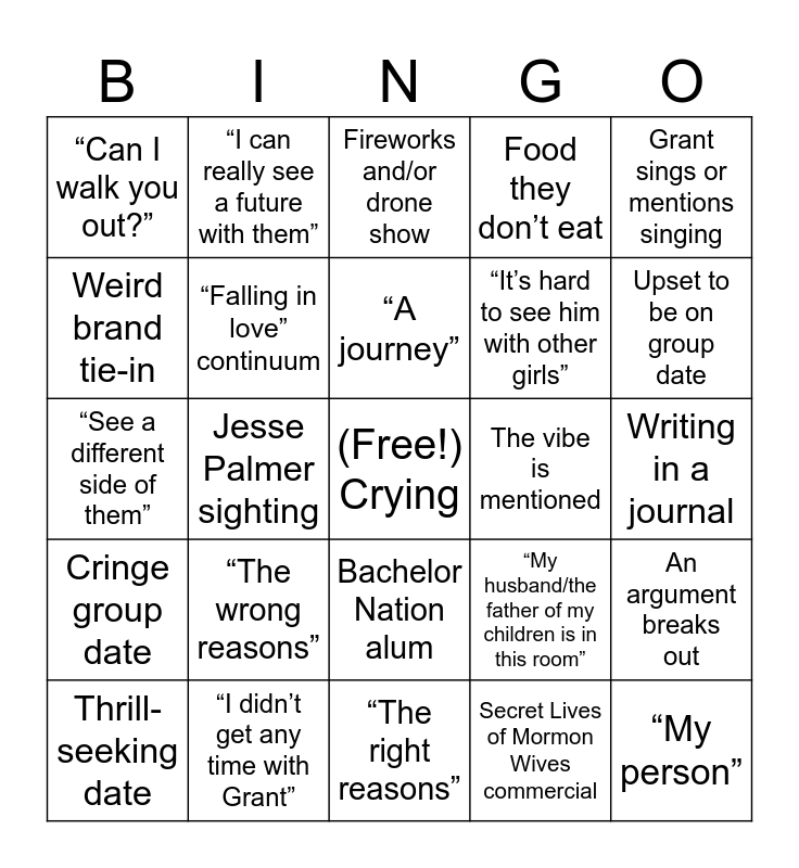 This bingo card has a free space and 49 words: Cloud 9, “My person”, Basketball is mentioned, “The right reasons”, “The wrong reasons”, “Can I steal you?”, “I can really see a future with them”, “I am falling for Grant”, Weird brand tie-in, Cloud 10, “Falling in love” continuum, Food they don’t eat, An argument breaks out, “My husband/the father of my children is in this room”, Tragic backstory, “There’s something I really need to tell him/you”, “A journey”, The vibe is mentioned, “Feeling a connection”, Grant sings or mentions singing, Jesse Palmer sighting, Secret Lives of Mormon Wives commercial, “Can I walk you out?”, “It’s hard to see him with other girls”, “Ladies pack your bags”, Upset to be on group date, Thrill-seeking date, Helicopter date, Bachelor Nation alum, Cringe group date, Shouting “grant!” from a balcony, Run and jump into arms, “You look amazing”, Avoids discomfort by kissing, “I didn’t get any time with Grant”, Random bench, “My walls are up/coming down”, “I just want to be seen/chosen, Writing in a journal, “I’ve never been treated/felt like this before”, “Meaningful gift is given”, Shirtless grant (showering?), “Apply now for the Golden Bachelor”, Kissing Grant in front of the other girls, “See a different side of them”, Fireworks and/or drone show, “He is everything I’m looking for in a man/boyfriend/husband, “Ready to find love/get married” and Small table in a large room.
