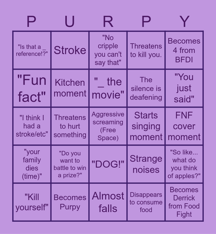 This bingo card has a free space and 34 words: Crazy Characters Reference, Disappears to consume food, Dementia, Oppagagnastyle, "your family dies (time)", Kitchen moment, Becomes 4 from BFDI, "Kill yourself", Stroke, He forgorđź’€, "_ the movie", "No cripple you can't say that", "What the f---?", Insert random quote here, Starts singing moment, "You just said", Becomes Purpy, "I think I had a stroke/etc", "Do you want to battle to win a prize?", Strange noises, "DOG!", Internet Dies, "Is that a _ reference!?", FNF cover moment, Almost falls, Becomes Derrick from Food Fight, Threatens to kill you., Imminent confusion, The silence is deafening, "Fun fact", Something Canadian, Threatens to hurt something, "So like... what do you think of apples?" and E.