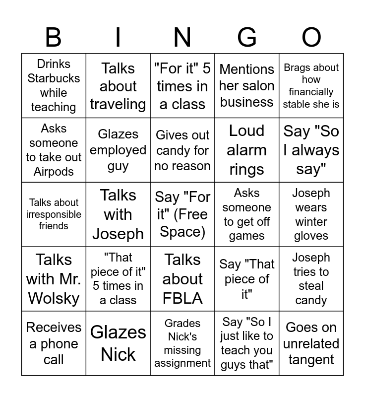 This bingo card has a free space and 24 words: "That piece of it" 5 times in a class, Glazes Nick, Gives out candy for no reason, Receives a phone call, Brags about how financially stable she is, Drinks Starbucks while teaching, Asks someone to take out Airpods, Talks about traveling, Asks someone to get off games, Talks about FBLA, Loud alarm rings, Talks about irresponsible friends, Say "That piece of it", Joseph tries to steal candy, Glazes employed guy, Say "So I just like to teach you guys that", Joseph wears winter gloves, "For it" 5 times in a class, Say "So I always say", Talks with Joseph, Goes on unrelated tangent, Talks with Mr. Wolsky, Mentions her salon business and Grades Nick's missing assignment.