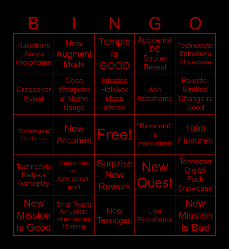 This bingo card has a free space and 24 words: Pablo has an AWESOME shirt, Small Teaser for update after Techrot Uprising, Infested Holokey ideas altered, New Mission is Good, Technocyte Ephemera Showcase, Rusalka is Saryn Protoframe, Crossover Event, New Augment Mods, "Revenant" is mentioned, Surprise New Rework, Ash Protoframe, "Spiderframe" mentioned, New Quest, Tennocon Digital Pack Showcase, Coda Weapons in Game Usage, Loki Protoframe, 1999 Fissures, Temple is GOOD, Psuedo-Exalted Change is Good, New Arcanes, New Mission is Bad, Technocyte Railjack Gameplay, Accidental DE Spoiler Reveal and New Tennogen.