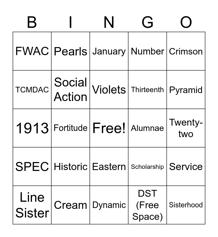 This bingo card has a free space and 25 words: Historic, Dynamic, Violets, Line Sister, Crimson, FWAC, TCMDAC, Pearls, Alumnae, Eastern, Thirteenth, 1913, Scholarship, Service, Social Action, Soror, Twenty-two, January, Pyramid, Fortitude, Sisterhood, Cream, SPEC, Number and DST (Free Space).