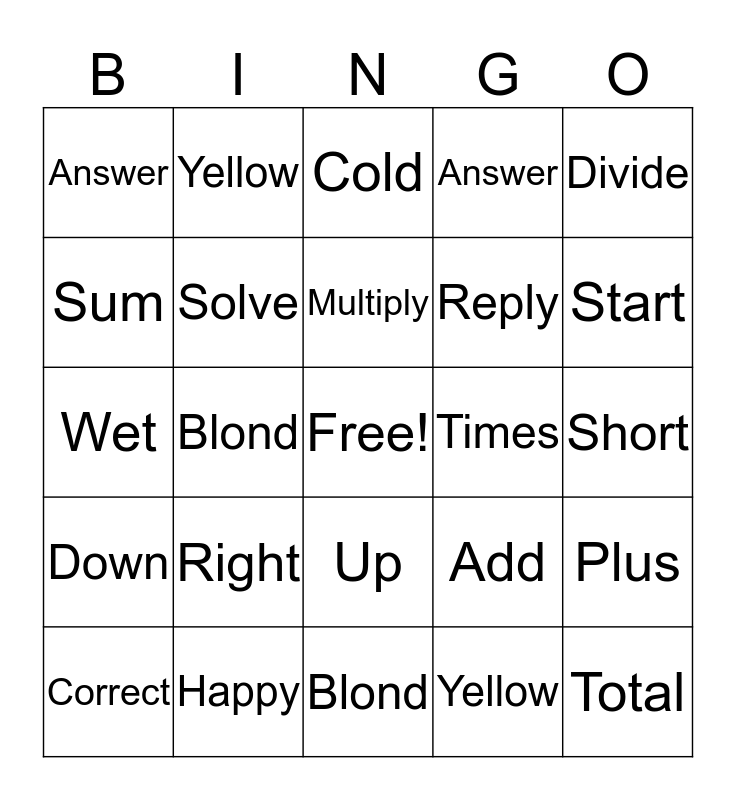 This bingo card has a free space and 48 words: Sum, Total, Thin, Blond, Right, Wet, Yellow, Dry, Sum, Total, Solve, Answer, Plus, Add, Subtract, Minus, Multiply, Times, Division, Divide, Blond, Yellow, Answer, Reply, Begin, Start, Correct, Right, Up, Down, Small, Big, Thin, Thick, Happy, Sad, Tall, Short, Good, Bad, Interesting, Boring, Cold, Hot, Wet, Dry, Nice and Mean.