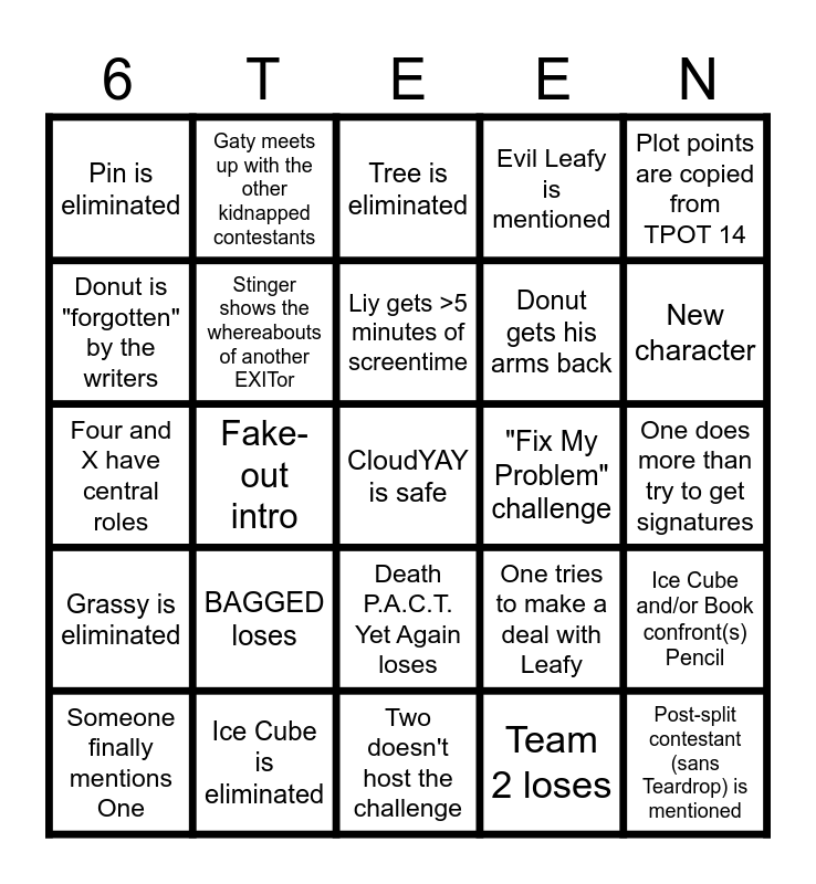This bingo card has a free space and 24 words: BAGGED loses, Ice Cube is eliminated, Liy gets >5 minutes of screentime, Someone finally mentions One, Plot points are copied from TPOT 14, Pin is eliminated, Donut is "forgotten" by the writers, Gaty meets up with the other kidnapped contestants, "Fix My Problem" challenge, Death P.A.C.T. Yet Again loses, Donut gets his arms back, Four and X have central roles, One tries to make a deal with Leafy, Ice Cube and/or Book confront(s) Pencil, Stinger shows the whereabouts of another EXITor, Team 2 loses, One does more than try to get signatures, Tree is eliminated, New character, Fake-out intro, Post-split contestant (sans Teardrop) is mentioned, Grassy is eliminated, Evil Leafy is mentioned and Two doesn't host the challenge.