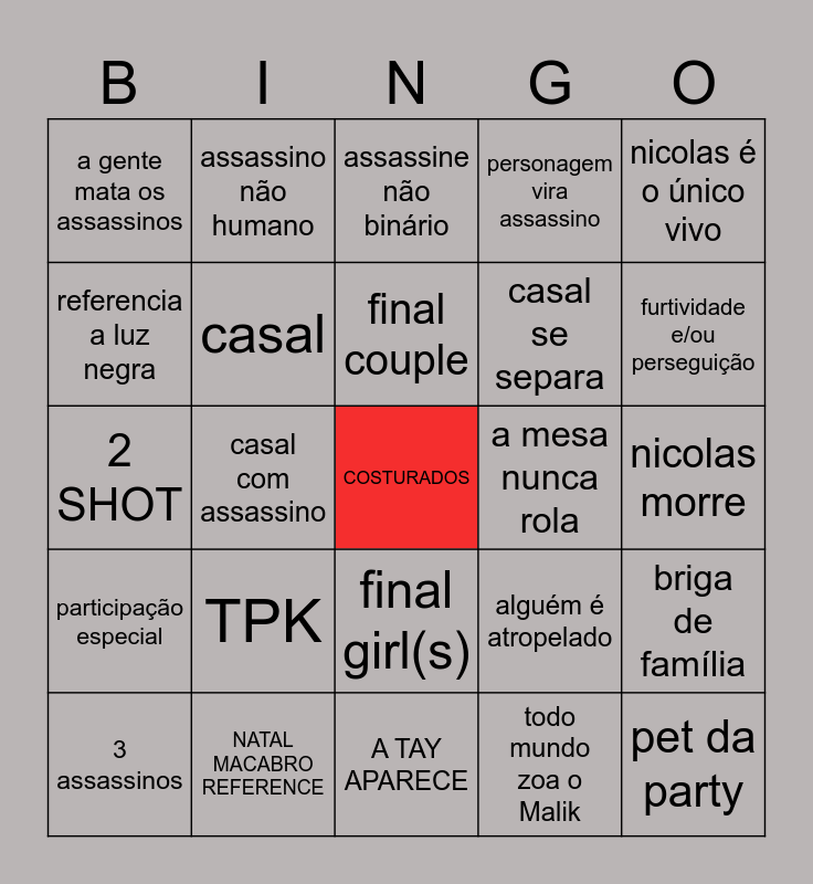 This bingo card has a free space and 24 words: TPK, NATAL MACABRO REFERENCE, final couple, 3 assassinos, nicolas é o único vivo, a gente mata os assassinos, referencia a luz negra, assassino não humano, a mesa nunca rola, final girl(s), casal se separa, 2 SHOT, alguém é atropelado, briga de família, casal, todo mundo zoa o Malik, nicolas morre, assassine não binário, furtividade e/ou perseguição, casal com assassino, pet da party, participação especial, personagem vira assassino and A TAY APARECE.