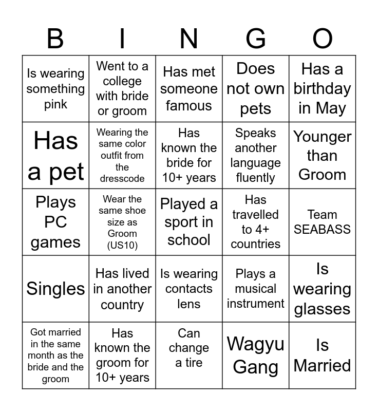 This bingo card has a free space and 24 words: Has lived in another country, Has known the groom for 10+ years, Has known the bride for 10+ years, Got married in the same month as the bride and the groom, Has a birthday in May, Is wearing something pink, Has a pet, Went to a college with bride or groom, Has travelled to 4+ countries, Is wearing contacts lens, Speaks another language fluently, Plays PC games, Plays a musical instrument, Is wearing glasses, Wearing the same color outfit from the dresscode, Wagyu Gang, Team SEABASS, Has met someone famous, Younger than Groom, Wear the same shoe size as Groom (US10), Is Married, Singles, Does not own pets and Can change a tire.