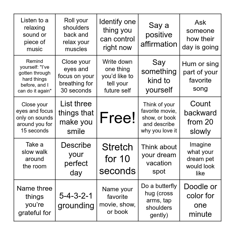 This bingo card has a free space and 24 words: Describe your perfect day, 5-4-3-2-1 grounding, Write down one thing you’d like to tell your future self, Name three things you’re grateful for, Ask someone how their day is going, Listen to a relaxing sound or piece of music, Remind yourself: "I’ve gotten through hard things before, and I can do it again", Roll your shoulders back and relax your muscles, Think of your favorite movie, show, or book and describe why you love it, Stretch for 10 seconds, Say something kind to yourself, Close your eyes and focus only on sounds around you for 15 seconds, Think about your dream vacation spot, Imagine what your dream pet would look like, Close your eyes and focus on your breathing for 30 seconds, Do a butterfly hug (cross arms, tap shoulders gently), Count backward from 20 slowly, Identify one thing you can control right now, Hum or sing part of your favorite song, List three things that make you smile, Doodle or color for one minute, Take a slow walk around the room, Say a positive affirmation and Name your favorite movie, show, or book.