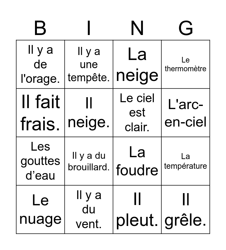 This bingo card has 37 words: Free!, Il fait beau., Il fait mauvais., Le ciel est clair., La nuit, Le jour, L'arc-en-ciel, Il fait froid., Il fait frais., Il fait chaud., La température, Le thermomètre, Le nuage, Il pleut., Il neige., Il grêle., La pluie, La neige, La grêle, Il y a du vent., Il y a de l'orage., Il y a du brouillard., Il y a des nuages., Le vent, Le brouillard, Les nuages, Il y a une tempête., Il y a du soleil., L'éclair, Les éclairs, Le soleil, La lune, La foudre, Le parapluie, La glace, Les gouttes d’eau and Le flocon de neige.