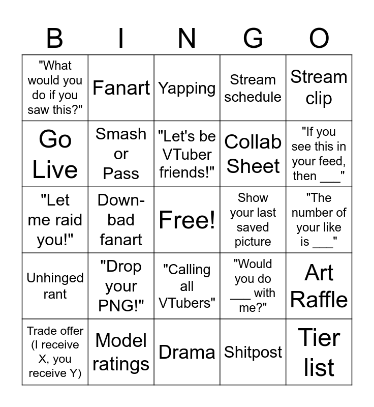 This bingo card has a free space and 24 words: "Drop your PNG!", Model ratings, "Let's be VTuber friends!", Trade offer (I receive X, you receive Y), Stream clip, "What would you do if you saw this?", Go Live, Fanart, Show your last saved picture, "Calling all VTubers", Collab Sheet, "Let me raid you!", "Would you do ___ with me?", Art Raffle, Smash or Pass, Shitpost, "The number of your like is ___", Yapping, "If you see this in your feed, then ___", Down-bad fanart, Tier list, Unhinged rant, Stream schedule and Drama.