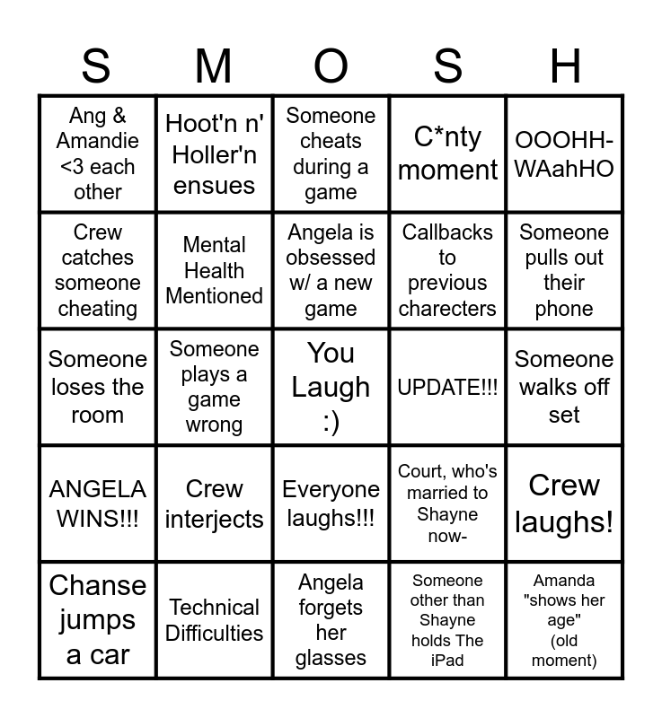 This bingo card has a free space and 24 words: Chanse jumps a car, Crew interjects, Angela is obsessed w/ a new game, Someone other than Shayne holds The iPad, OOOHH-WAahHO, Ang & Amandie <3 each other, Hoot'n n' Holler'n ensues, Someone cheats during a game, UPDATE!!!, Someone walks off set, Someone loses the room, Mental Health Mentioned, Court, who's married to Shayne now-, Crew laughs!, Crew catches someone cheating, Technical Difficulties, Angela forgets her glasses, C*nty moment, Someone pulls out their phone, ANGELA WINS!!!, Someone plays a game wrong, Everyone laughs!!!, Callbacks to previous charecters and Amanda "shows her age" (old moment).