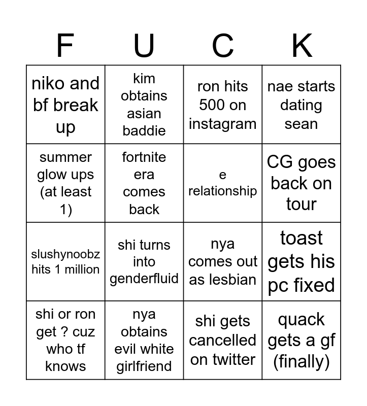 This bingo card has 16 words: nya obtains evil white girlfriend, toast gets his pc fixed, ron hits 500 on instagram, niko and bf break up, slushynoobz hits 1 million, kim obtains asian baddie, nya comes out as lesbian, shi gets cancelled on twitter, summer glow ups (at least 1), fortnite era comes back, shi or ron get ? cuz who tf knows, nae starts dating sean, shi turns into genderfluid, CG goes back on tour, e relationship and quack gets a gf (finally).