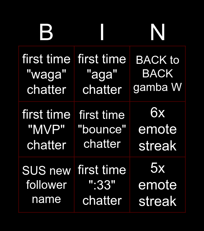 This bingo card has a free space and 8 words: 6x emote streak, BACK to BACK gamba W, first time "aga" chatter, SUS new follower name, first time "waga" chatter, 5x emote streak, first time "MVP" chatter and first time ":33" chatter.