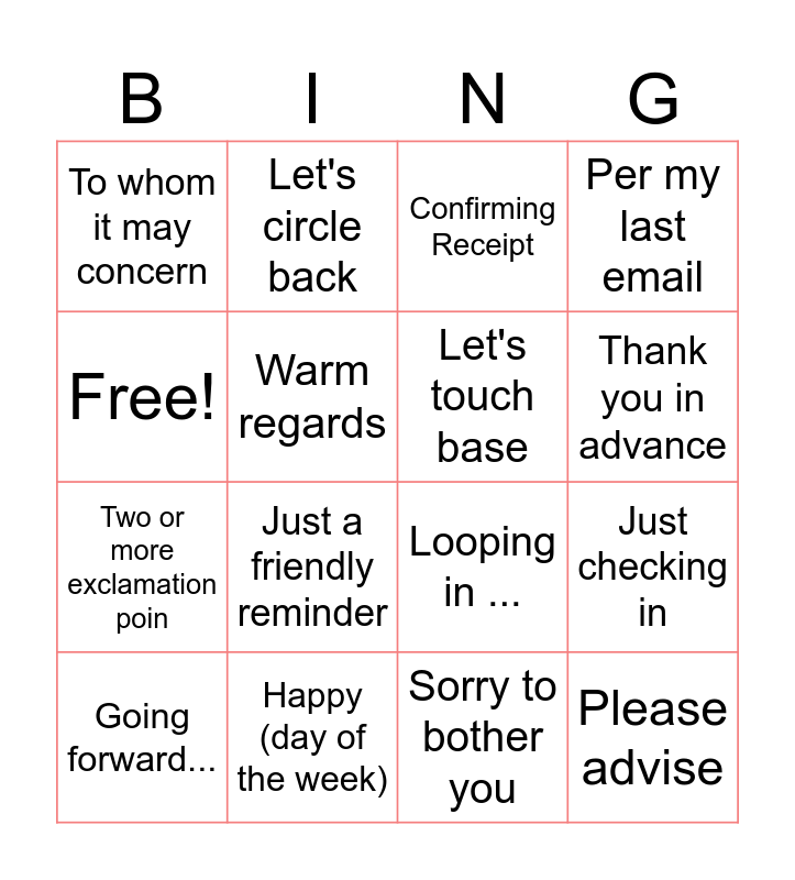 This bingo card has 16 words: Happy (day of the week), Just checking in, Confirming Receipt, To whom it may concern, Two or more exclamation poin, Let's circle back, Looping in ..., Sorry to bother you, Free!, Warm regards, Going forward..., Per my last email, Just a friendly reminder, Thank you in advance, Let's touch base and Please advise.