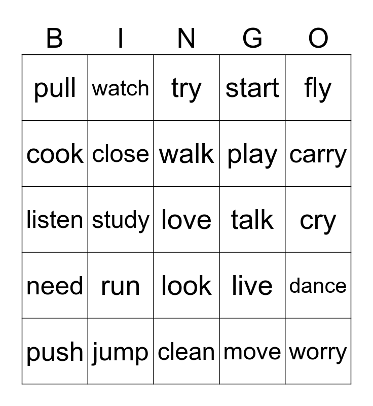 This bingo card has a free space and 24 words: run, jump, walk, push, fly, pull, cook, watch, talk, look, play, listen, live, dance, close, move, cry, try, carry, study, worry, need, start and clean.