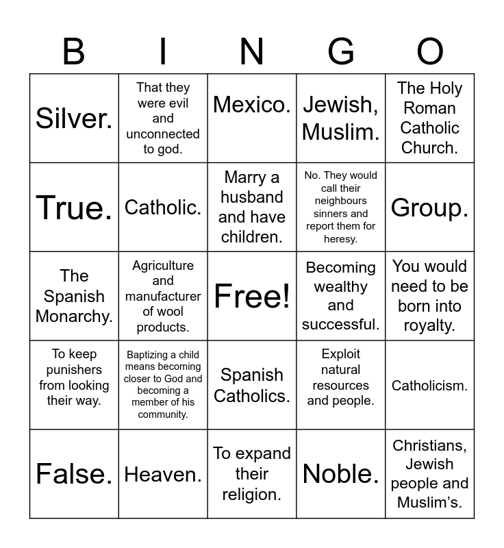 This bingo card has a free space and 24 words: Baptizing a child means becoming closer to God and becoming a member of his community., Heaven., Marry a husband and have children., False., The Holy Roman Catholic Church., Silver., True., That they were evil and unconnected to god., Becoming wealthy and successful., Spanish Catholics., No. They would call their neighbours sinners and report them for heresy., The Spanish Monarchy., Exploit natural resources and people., Catholicism., Catholic., Noble., You would need to be born into royalty., Mexico., Group., Agriculture and manufacturer of wool products., Christians, Jewish people and Muslim’s., To keep punishers from looking their way., Jewish, Muslim. and To expand their religion..