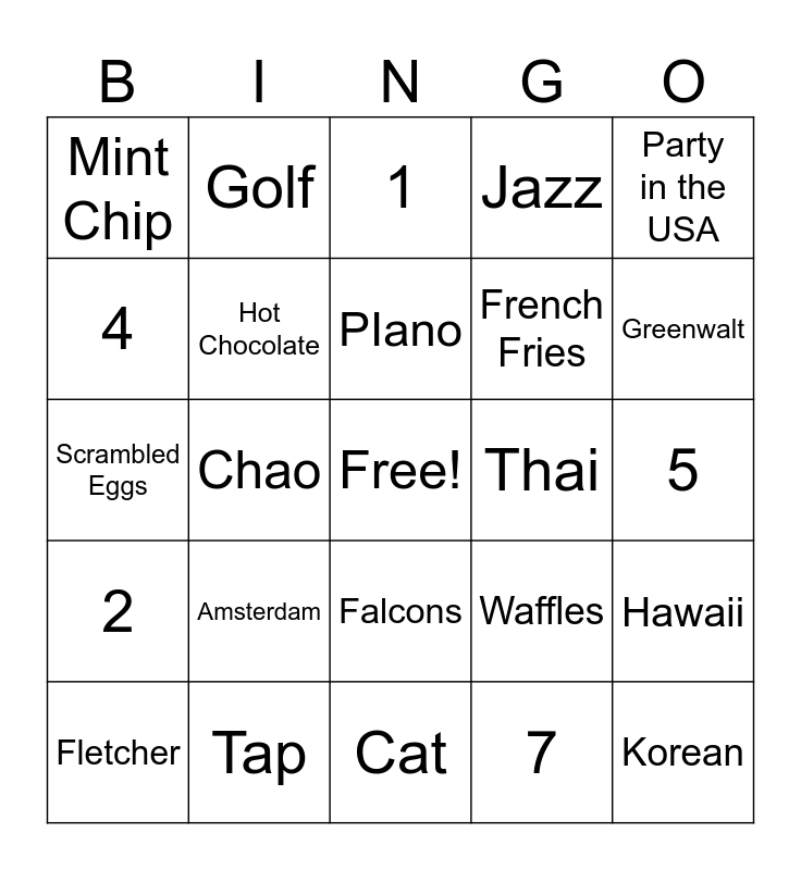 This bingo card has a free space and 24 words: Amsterdam, Tap, PIano, Fletcher, Party in the USA, Mint Chip, 4, Golf, Thai, Falcons, French Fries, Scrambled Eggs, Waffles, Hawaii, Hot Chocolate, 7, 5, 1, Greenwalt, Chao, Korean, 2, Jazz and Cat.