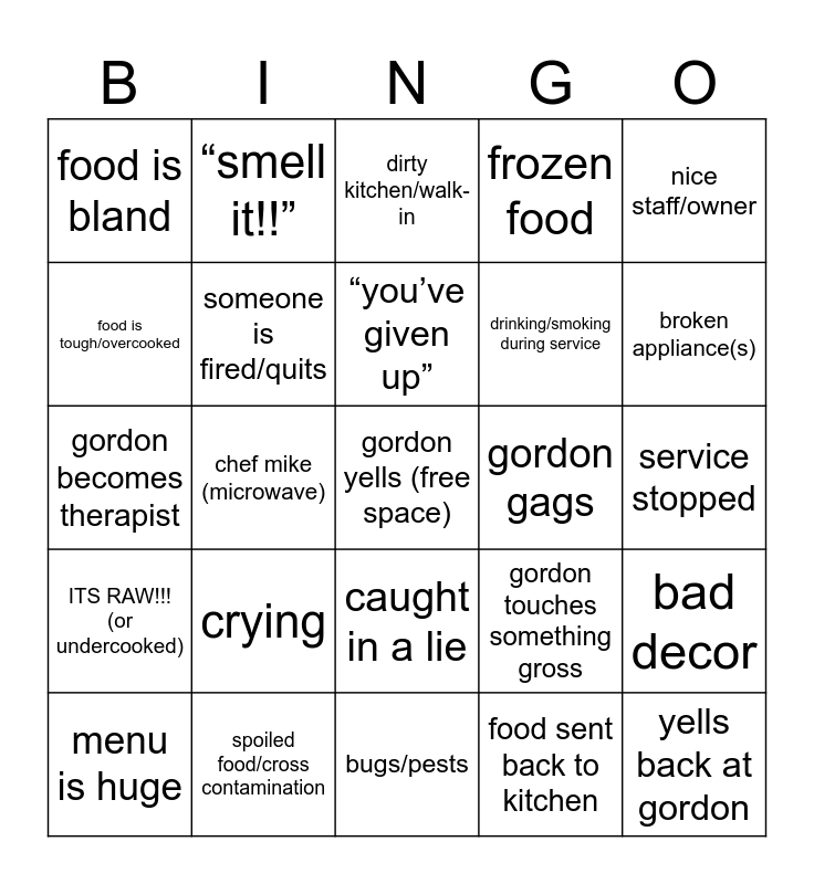 This bingo card has a free space and 24 words: crying, spoiled food/cross contamination, “you’ve given up”, menu is huge, nice staff/owner, food is bland, food is tough/overcooked, “smell it!!”, gordon gags, caught in a lie, drinking/smoking during service, gordon becomes therapist, gordon touches something gross, bad decor, someone is fired/quits, food sent back to kitchen, service stopped, dirty kitchen/walk-in, broken appliance(s), chef mike (microwave), yells back at gordon, ITS RAW!!! (or undercooked), frozen food and bugs/pests.