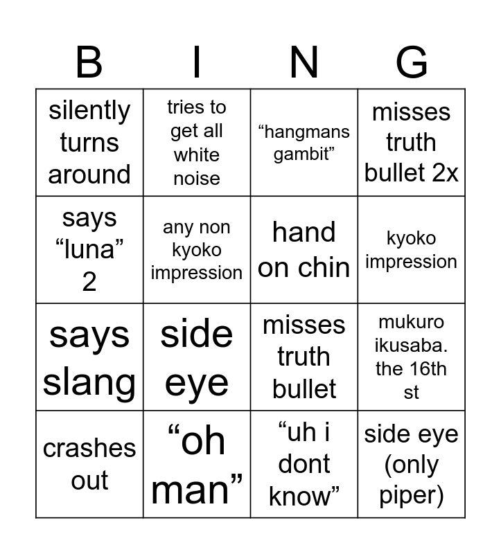 This bingo card has 18 words: side eye, side eye (only piper), “hangmans gambit”, silently turns around, misses truth bullet, misses truth bullet 2x, crashes out, tries to get all white noise, kyoko impression, says slang, “uh i dont know”, says “luna” 2, mukuro ikusaba. the 16th st, any non kyoko impression, hand on chin, comment on hiiro, “oh man” and comment on toko.