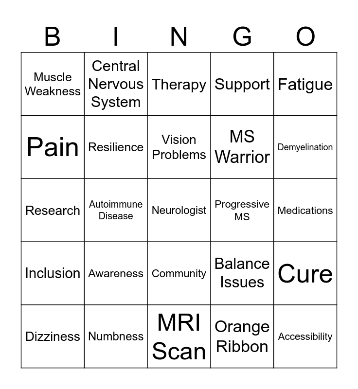 This bingo card has 26 words: Inclusion, Numbness, Vision Problems, Orange Ribbon, Fatigue, Muscle Weakness, Resilience, Therapy, MS Warrior, Accessibility, Pain, Autoimmune Disease, MRI Scan, Balance Issues, Medications, Dizziness, Central Nervous System, Community, Support, Cure, Research, Awareness, Neurologist, Progressive MS, Demyelination and Demyelination.