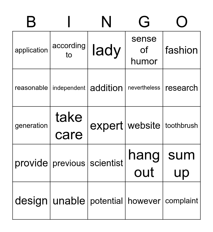 This bingo card has a free space and 29 words: design, low, take care, however, application, lady, independent, previous, website, unable, toothbrush, complaint, potential, however, research, findings, scientist, provide, fashion, generation, hang out, goal, nevertheless, reasonable, sense of humor, according to, sum up, addition and hope.
