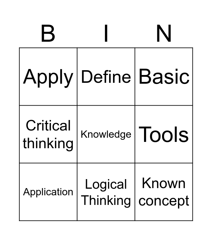 This bingo card has a free space and 8 words: Tools, Basic, Define, Application, Apply, Known concept, Critical thinking and Logical Thinking.