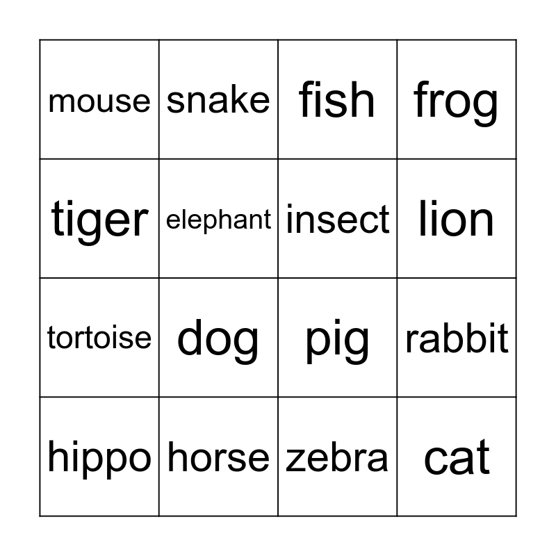 This bingo card has 23 words: cat, octopus, lion, bear, tiger, mouse, elephant, snake, hippo, fox, dog, tortoise, bird, crocodile, horse, duck, fish, pig, insect, rabbit, frog, zebra and panda.
