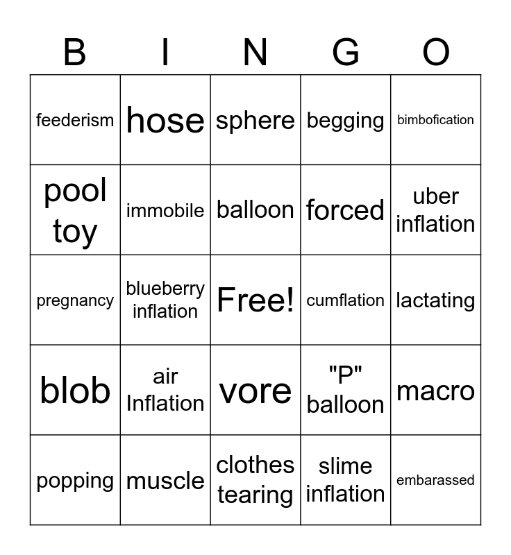 This bingo card has a free space and 24 words: air Inflation, muscle, balloon, popping, bimbofication, feederism, pool toy, hose, cumflation, vore, forced, pregnancy, "P" balloon, macro, immobile, slime inflation, lactating, sphere, uber inflation, blueberry inflation, embarassed, blob, begging and clothes tearing.