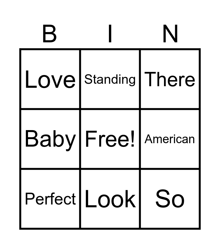This bingo card has a free space and 11 words: You, Look, So, Perfect, Standing, There, American, Crazy, Baby, Love and Blue.