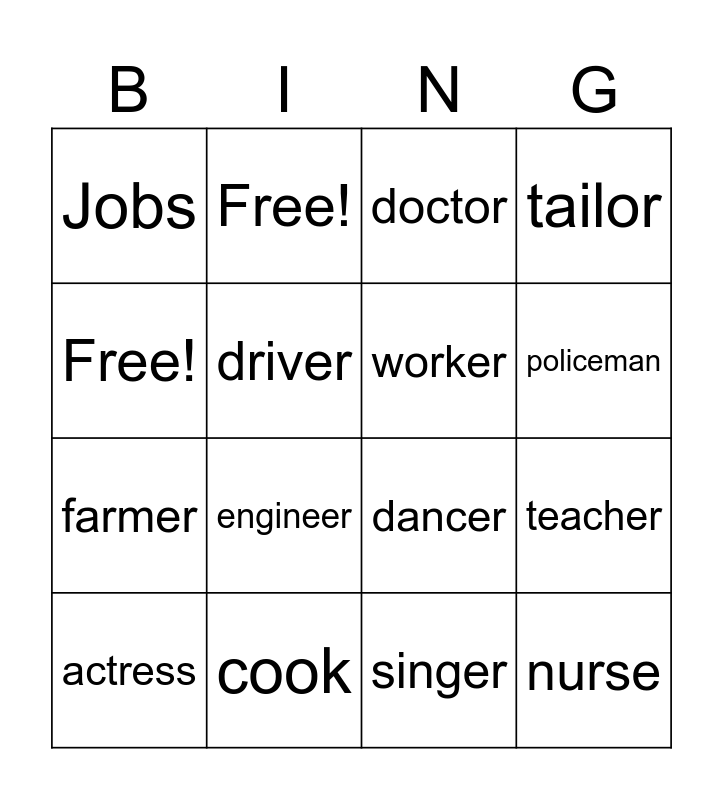 This bingo card has 16 words: cook, teacher, doctor, Jobs, farmer, Free!, dancer, singer, Free!, driver, actress, tailor, engineer, policeman, worker and nurse.