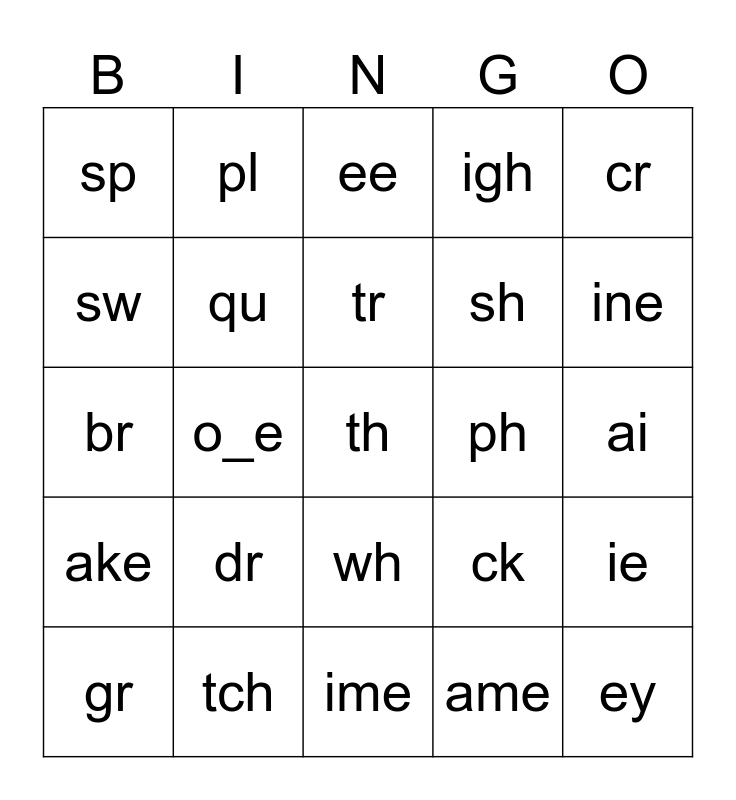 This bingo card has a free space and 24 words: dr, tch, tr, gr, cr, sp, sw, pl, ph, wh, sh, br, ck, ie, qu, ame, ai, ee, ine, o_e, ey, ake, igh and ime.