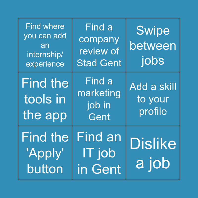 This bingo card has 15 words: Find your saved jobs, Find where you can add a degree, Swipe between jobs, Find where you can add an internship/ experience, Find an IT job in Gent, Find a marketing job in Gent, Find the Salary Calculator, Find your job alert(s), Add a skill to your profile, Dislike a job, Like a job, Find the tools in the app, Find the 'Apply' button, Find a company review of Stad Gent and Find a job in your sector and save it.