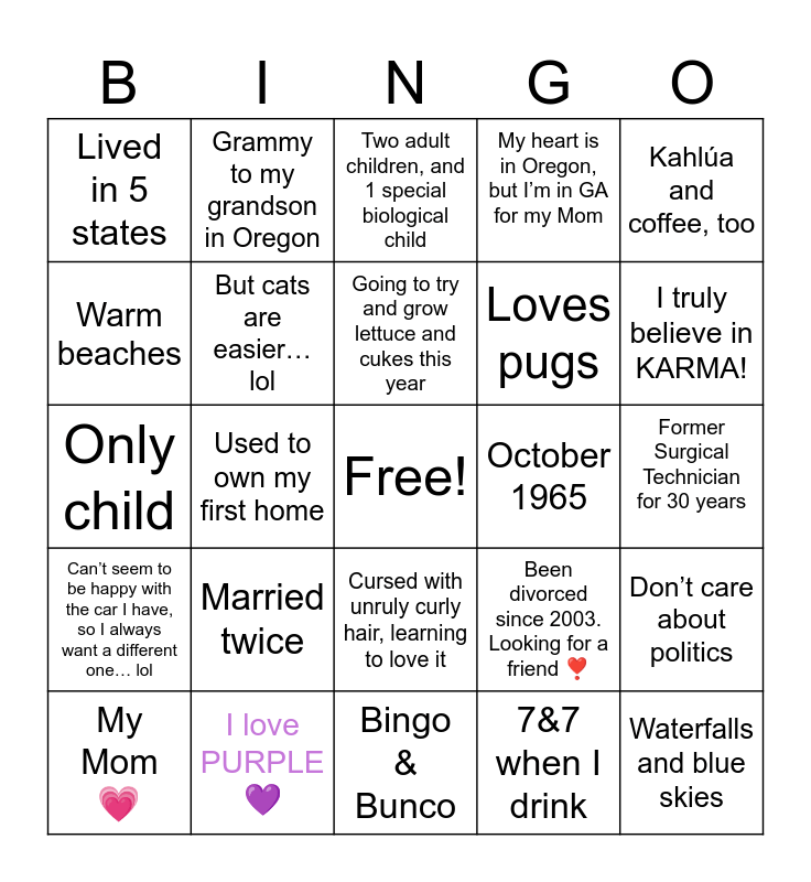 This bingo card has a free space and 24 words: Married twice, I love PURPLE 💜, Going to try and grow lettuce and cukes this year, My Mom💗, Kahlúa and coffee, too, Lived in 5 states, Warm beaches, Grammy to my grandson in Oregon, October 1965, Cursed with unruly curly hair, learning to love it, Loves pugs, Only child, Been divorced since 2003. Looking for a friend ❣️, Don’t care about politics, But cats are easier…lol, 7&7 when I drink, Former Surgical Technician for 30 years, Two adult children, and 1 special biological child, I truly believe in KARMA!, Used to own my first home, Waterfalls and blue skies, Can’t seem to be happy with the car I have, so I always want a different one… lol, My heart is in Oregon, but I’m in GA for my Mom and Bingo & Bunco.