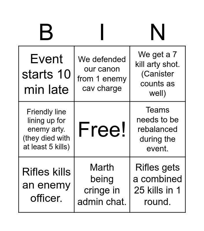 This bingo card has a free space and 8 words: Teams needs to be rebalanced during the event., We get a 7 kill arty shot. (Canister counts as well), We defended our canon from 1 enemy cav charge, Rifles kills an enemy officer., Event starts 10 min late, Rifles gets a combined 25 kills in 1 round., Friendly line lining up for enemy arty. (they died with at least 5 kills) and Marth being cringe in admin chat..