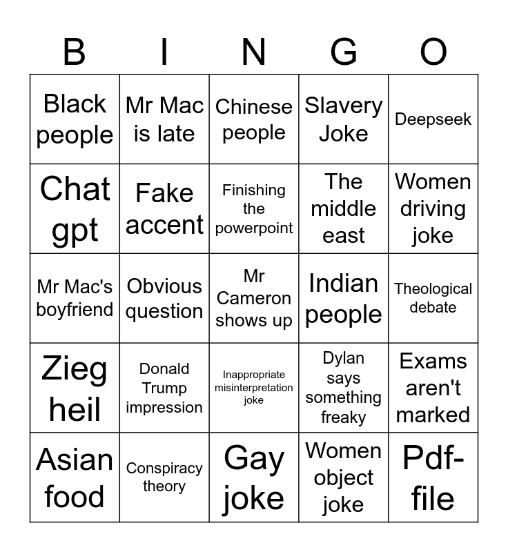 This bingo card has a free space and 29 words: Asian food, Golf, Obvious question, No one laughs at joke, Black people, Chinese people, Fake accent, Donald Trump impression, Indian people, Conspiracy theory, Theological debate, Pdf-file, Gay joke, Women object joke, Women driving joke, Inappropriate gesture joke, Inappropriate misinterpretation joke, Zieg heil, Deepseek, Mr Mac's boyfriend, Dylan says something freaky, Lewis says something freaky, The middle east, Chat gpt, Slavery Joke, Mr Mac is late, Exams aren't marked, Finishing the powerpoint and Mr Mac story time.