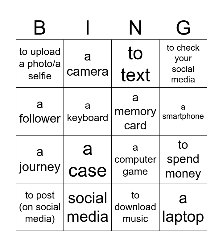 This bingo card has 20 words: to spend money, to spend time, to text, to message/to send a message, to post (on social media), a follower, social media, to upload a photo/a selfie, a journey, a camera, a case, a computer game, a keyboard, a laptop, a memory card, a mouse, a smartphone, to check your social media, to download music and to email a friend.