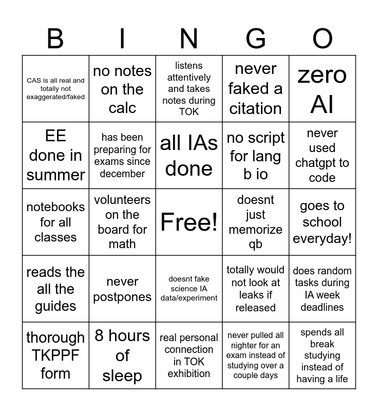 This bingo card has a free space and 24 words: never postpones, 8 hours of sleep, all IAs done, thorough TKPPF form, zero AI, CAS is all real and totally not exaggerated/faked, EE done in summer, no notes on the calc, doesnt just memorize qb, doesnt fake science IA data/experiment, no script for lang b io, notebooks for all classes, totally would not look at leaks if released, does random tasks during IA week deadlines, has been preparing for exams since december, never pulled all nighter for an exam instead of studying over a couple days, goes to school everyday!, listens attentively and takes notes during TOK, never used chatgpt to code, volunteers on the board for math, spends all break studying instead of having a life, reads the all the guides, never faked a citation and real personal connection in TOK exhibition.