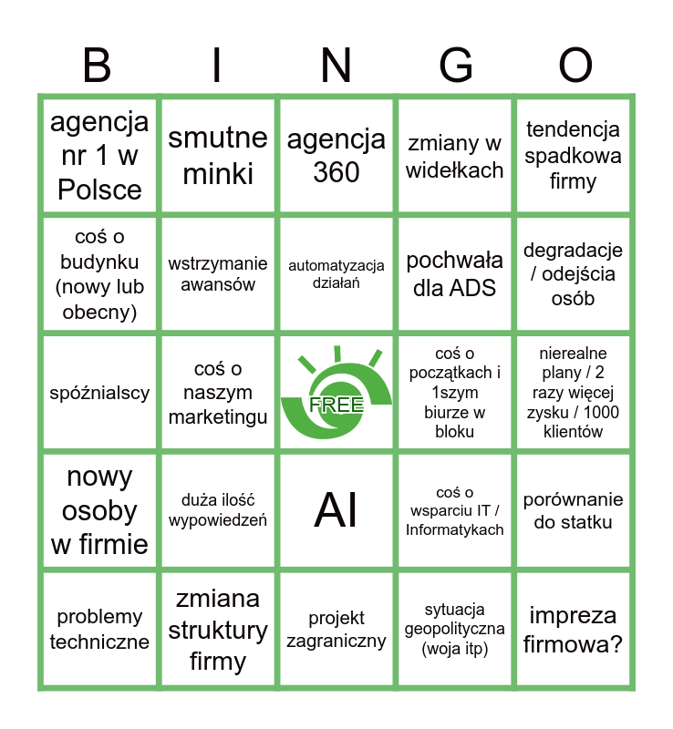This bingo card has a free space and 28 words: porównanie do statku, słaby kwartał, pochwała dla ADS, sytuacja geopolityczna (woja itp), coś o budynku (nowy lub obecny), agencja 360, smutne minki, nowy osoby w firmie, coś o początkach i 1szym biurze w bloku, problemy techniczne, spóźnialscy, zmiany w widełkach, zmiana struktury firmy, projekt zagraniczny, degradacje / odejścia osób, rekrutacja otwarta do większości działów, duża ilość wypowiedzeń, wstrzymanie awansów, automatyzacja działań, AI, agencja nr 1 w Polsce, coś o lojalnych, impreza firmowa?, coś o naszym marketingu, nierealne plany / 2 razy więcej zysku / 1000 klientów, coś o wsparciu IT / Informatykach, tendencja spadkowa firmy and coś o meta amazon allegro ads.