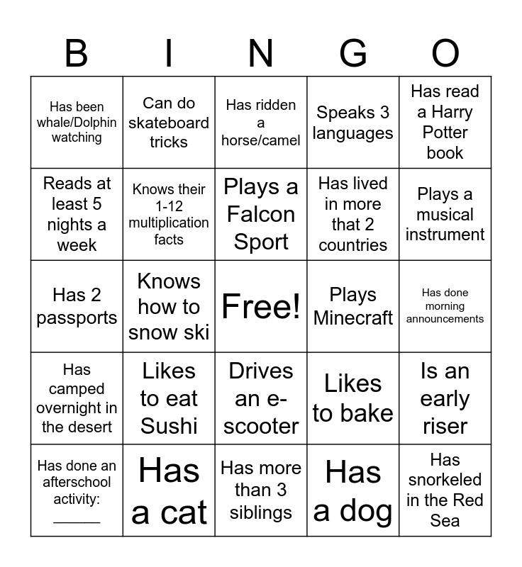 This bingo card has a free space and 25 words: Likes to eat Sushi, Has more than 3 siblings, Plays a Falcon Sport, Has done an afterschool activity: ______, Has read a Harry Potter book, Has been whale/Dolphin watching, Reads at least 5 nights a week, Can do skateboard tricks, Plays Minecraft, Drives an e-scooter, Has lived in more that 2 countries, Has 2 passports, Likes to bake, Is an early riser, Knows their 1-12 multiplication facts, Likes to rollerskate/rollerblade, Has done morning announcements, Has ridden a horse/camel, Plays a musical instrument, Knows how to snow ski, Has snorkeled in the Red Sea, Has a cat, Has camped overnight in the desert, Speaks 3 languages and Has a dog.