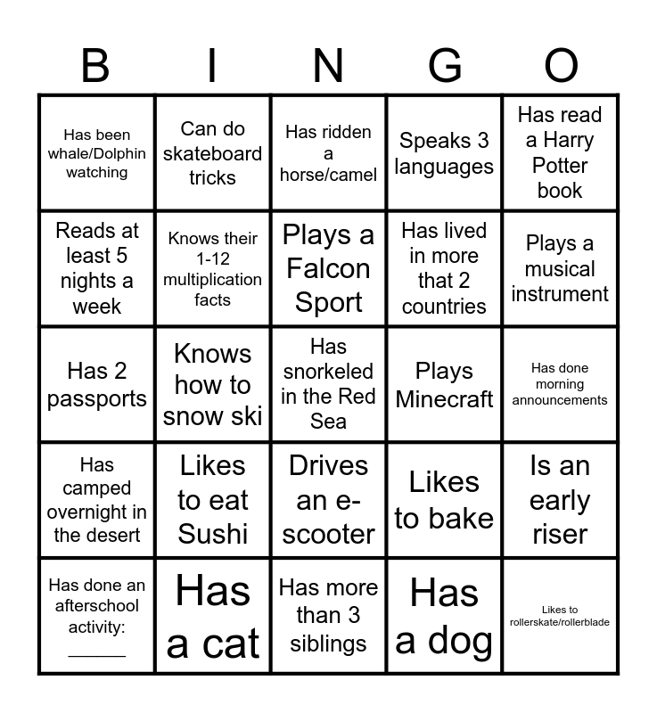 This bingo card has 25 words: Likes to eat Sushi, Has more than 3 siblings, Plays a Falcon Sport, Has done an afterschool activity: ______, Has read a Harry Potter book, Has been whale/Dolphin watching, Reads at least 5 nights a week, Can do skateboard tricks, Plays Minecraft, Drives an e-scooter, Has lived in more that 2 countries, Has 2 passports, Likes to bake, Is an early riser, Knows their 1-12 multiplication facts, Likes to rollerskate/rollerblade, Has done morning announcements, Has ridden a horse/camel, Plays a musical instrument, Knows how to snow ski, Has snorkeled in the Red Sea, Has a cat, Has camped overnight in the desert, Speaks 3 languages and Has a dog.