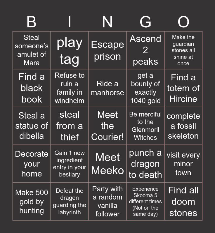 This bingo card has a free space and 140 words: get a dragon claw, punch a jarl, get the golden claw, fight a slaughterfish, cook breakfast, lunch and dinner, punch a dragon to death, shoot a cabbage into a kettle, win a battle of wit, decorate someone elses house, stack 10 cheese wheels ontop of each other, get jailed for a minor crime (below 40 gold), punch a guard in a minor town (Not riverwood), ruin a love triangle, solve a love triangle, kill, fluff or marry Carlotta instead, collect ten different types of alcohol, clear 5 caves, clear 5 nordic ruins, clear 2 dwemer ruins, visit every hold capital, visit every minor town in a hold (Minimum of 2), visit every minor town, kill a giant, kill a mammoth, get space launched, steal from a thief, play tag, play hide and seek, collect 5 different flying insects (alive), collect 5 different insect jars, finish a full display of the Museum (Can be any), do the treasure hunt of the Museum, collect 5 unique fossils, complete a fossil skeleton, complete a shout, collect 10 different shouts, kill 3 dragons, get a bounty of exactly 250 gold, get a bounty of exactly 1040 gold, help a Daedric lord, Get harassed by Thugs, Meet the Madwoman, Meet Meeko, Adopt a child, Get married, Steal Belethor’s sister (His most valuable possession), Bully Lars with Braith, Help Lars against Braith, Beat up a shitty bard in Whiterun, Win 5 brawls, Meet all the different travelling khajiit carevans, Meet Mai’q the Alfiq, Make 500 gold by hunting, Lead a bandit to a guard, Kill 10 rabbits you monster, Get a giant robot Waterlogged, Follow Lessons at the Bard College, Follow lessons at the Mage College, Do 5 radiant quests, Do a special contract for a faction, Boop Paarthurnax on the snoot, Experience Skooma 5 different times (Not on the same day), Go party with Sam and Roleplay the night afterwards, Pretend to be a guard for a shift, Buy a home, Decorate your home, Be mean to a child, Be mean to elderly, Be mean to a beggar, Gift gold to a beggar, Gift gold to 9 different beggars, Steal someone’s amulet of Mara, Steal a statue of dibella, Steal the statue of dibella in the temple, Slay the might Mudcrab boss near Crabby shanty (a dungeon from Ryn), Ascend a peak, Take a leap of faith, Take 3 leaps of faith, Ascend 2 peaks, Explore a forgotten temple (Relics of Hyrule), Discover the Museum (Relics of Hyrule), Find 5 different songs for your ocarina, Make a song about your deeds (Bards college), Make 5 songs about your deeds (Bards college), Find a totem of Hircine, Find all totems of Hircine, Be merciful to the Glenmoril Witches, Be genocidal to the Glenmoril Witches, Party with a random vanilla follower, Get a big group of modded followers, Go camping with a follower, Explore a land below the earth, Find the dragon trapped below the earth, Defeat the dragon guarding the labyrinth, Collect a dragon mask in Skyrim (Not wood), Collect the wooden dragon mask, Collect 3 dragon masks in Skyrim, Collect all dragon masks in Skyrim, Collect a dragon mask in Solstheim, Collect all the dragon masks in Solstheim, Find a black book, Find all black books, Complete your lusty Argonian maid collection, Ride a salmon, Ride a manhorse, Gain 1 new entry in your bestiary (Not ingredients), Gain 5 new entries in your bestiary (Not ingredients), Gain 10 new entries in your bestiary (Not ingredients), Gain a new legendary entry in your bestiary, Gain 1 new ingredient entry in your bestiary, Gain 5 new ingredient entries in your bestiary, Gain 10 new ingredient entries in your bestiary, Make the guardian stones all shine at once, Find all doom stones, Ruin a family in windhelm, Refuse to ruin a family in windhelm, Ruin a persons house, Kill a person in their house, Make the life mildly inconvenient for an NPC, Kill a patrol of soldiers, Kill a patrol of thalmor, Get the blessing of Kyne, Make your deity abandon you, Become a devout of your deity, Fix the gildergreen humanely (Don’ hurt the Eldergleam), Fix the gildergreen inhumanely (Use nettlebane on the eldergleam), Kill sinding and skin him, Refuse Hircine, Fuel the ebony blade to completion, Kill a NPC in plain sight and hide their body without being seen (Reloading is okay), Get shouted off of Snow-Throat mountain, Shout someone off of snow-throat mountain, Adopt a pet, Get naked in a city and run around, Escape the Chill, Escape prison, Escape prison without a secret passageway, Orphan a child and adopt them, Kill Grelod in the funniest way possible and Go baking.