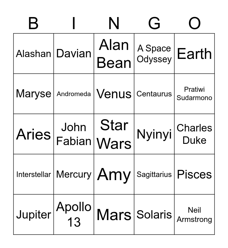 This bingo card has 25 words: Mercury, Mars, Venus, Jupiter, Earth, Alashan, Maryse, Davian, Nyinyi, Amy, Centaurus, Aries, Sagittarius, Pisces, Andromeda, Neil Armstrong, Charles Duke, Alan Bean, Pratiwi Sudarmono, John Fabian, Star Wars, Apollo 13, Interstellar, A Space Odyssey and Solaris.
